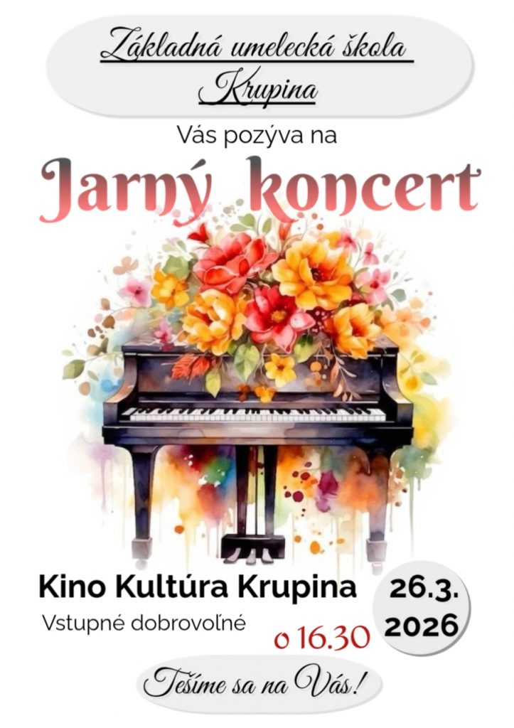 Srdečne Vás pozývame na tradičný Jarný koncert žiakov a pedagógov Základnej umeleckej školy v Krupine, ktorý sa uskutoční vo štvrtok 26. marca 2026 o 16.30 v Kine Kultúra.